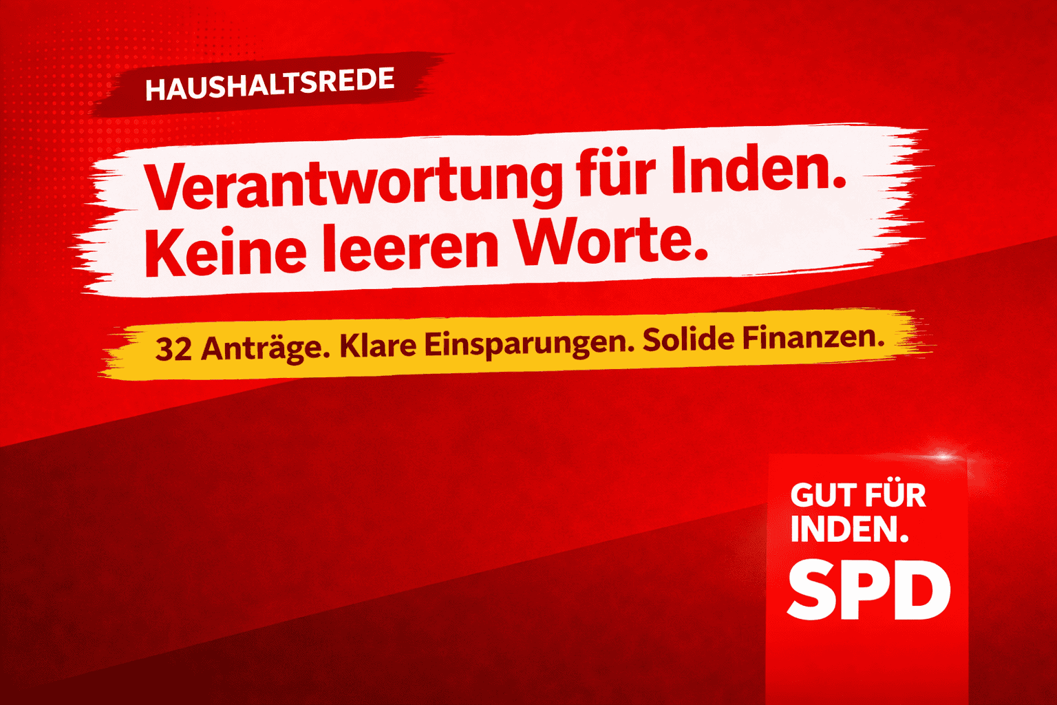 Nachdem wir durch die Verabschiedung des Haushaltes 2026 einschließlich Haushaltssicherungskonzept 2026 bis 2035 die Hausaufgaben gemacht haben, regt die SPD Fraktion an, unter Verweis auf das Schreiben an den Ministerpräsidenten Hendrik Wüst MdL vom 22.05.2024 „Brandbrief der Gemeinde Inden“ nachstehende Forderungen geltend zu machen, die zeitnah in einer gemeinsamen Resolution des Rates beschlossen werden sollen, deren Empfänger die Bundesregierung, die Landesregierung NRW, die demokratischen Fraktionen in Bund und Land sowie an die Abgeordneten des Bundestages und Landtages aus dem Kreis Düren sein sollen: